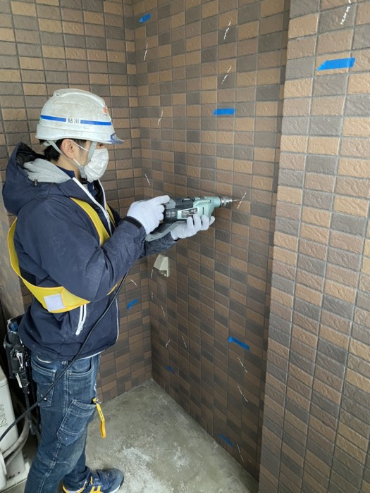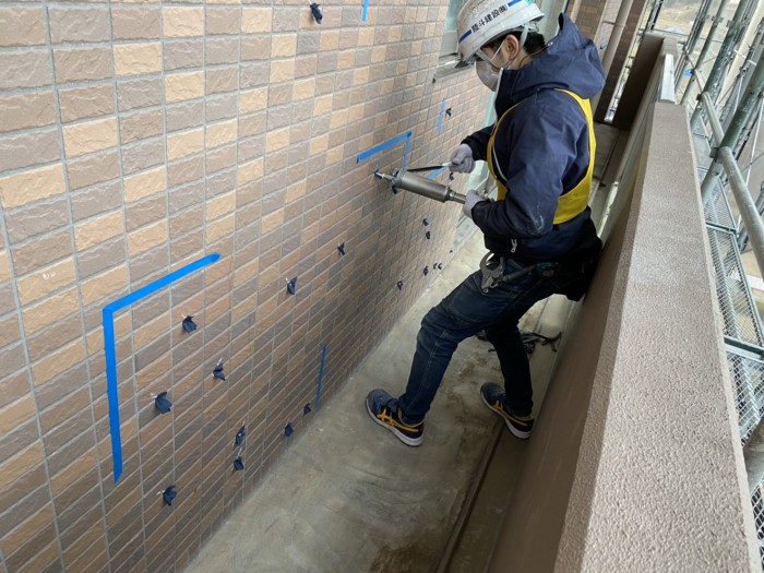 ピンニングエポキシ樹脂注入工法は、タイル張り仕上げまたはモルタル塗り仕上げの浮き部分をステンレスピンとエポキシ樹脂の接着力で固定する注入補修工法です。